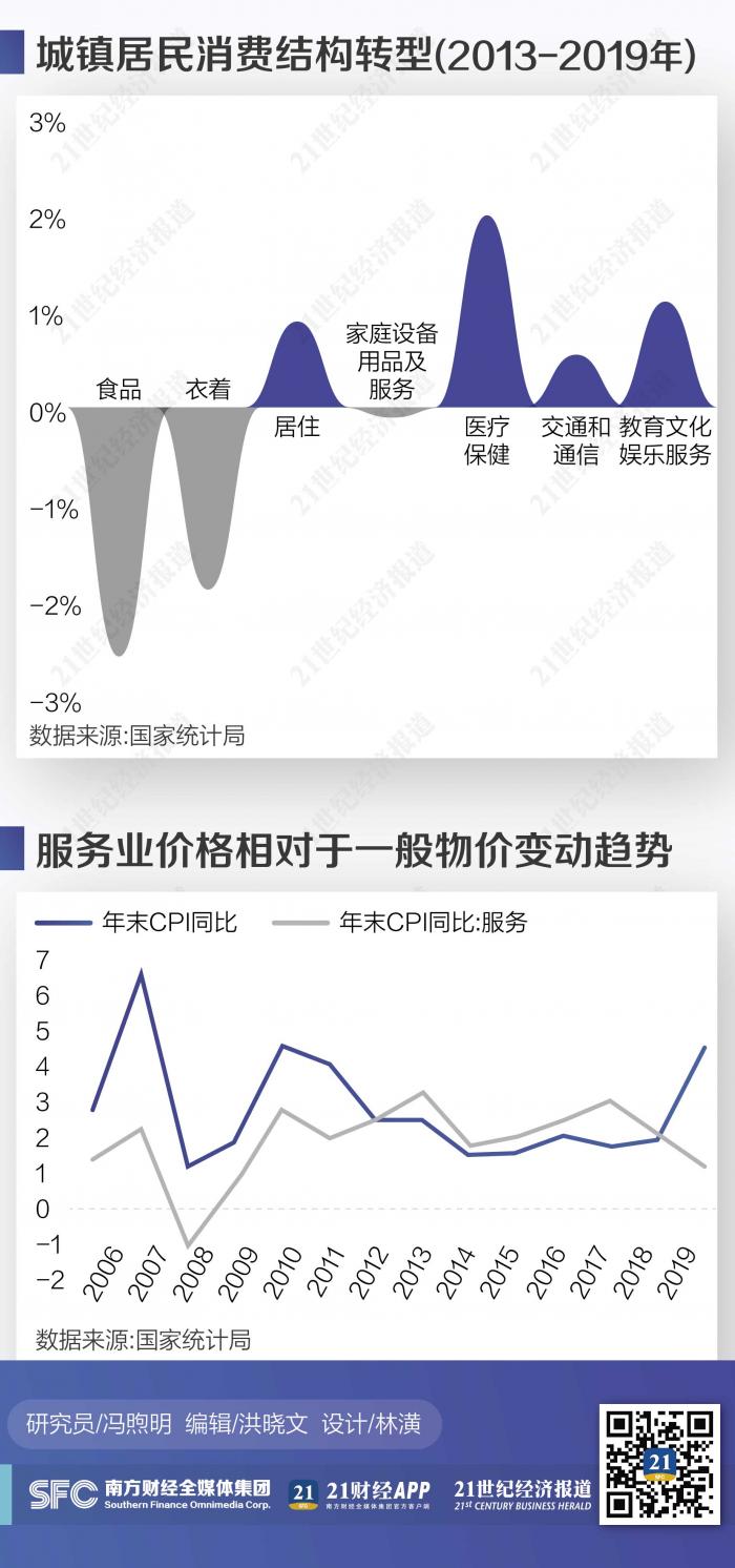现阶段我国需求结构转型的一大突出特征是,服务品在居民消费篮子中占比上升较快。根据“恩格尔效应”,随着家庭收入水平的提高,食品消费在总消费中所占比例会下降,非食品类消费的占比会上升。事实上,经济学家后来根据大量的微观实证研究又发现了所谓的“广义恩格尔效应”——当家庭收入水平超过一定门槛值之后,随着收入水平的继续提高,制造品消费在总消费中所占比例会下降,而服务品消费的占比会上升。“广义恩格尔效应”反映在宏观层面,就是宏观经济需求结构由制造品向服务品的转移。这正是我国经济在现阶段所经历的:2013-2019年,全国城镇居民人均医疗保健、教育文化娱乐、居住三大类服务消费的增速远高于总消费增速。六年间,医疗保健支出在总消费篮子中的占比提高了1.99个百分点,教育文化娱乐支出占比提高了1.10个百分点,居住支出占比提高了0.89个百分点,交通和通信支出占比提高了0.54个百分点;相应地,食品和衣着类消费支出则明显降低。农村居民的消费篮子结构大体上也呈现出类似变化。