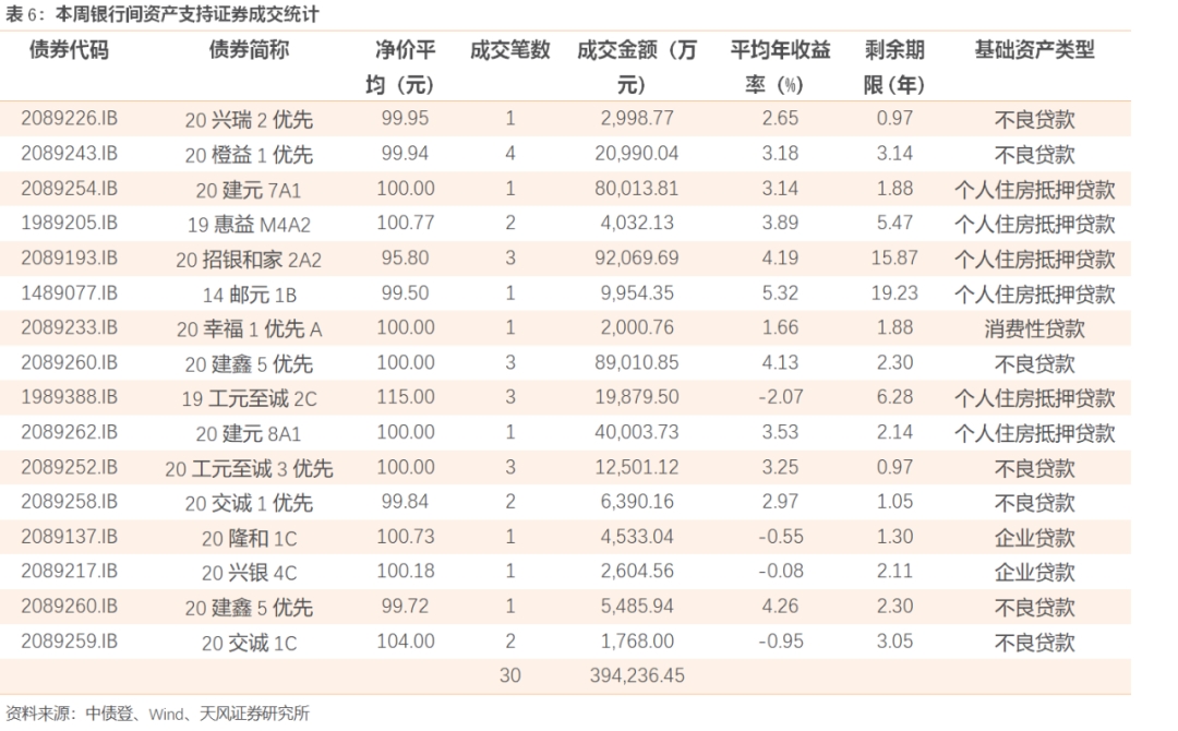 9月28日-30日银行间资产支持证券成交30笔,成交金额39.42亿元,基础资产包括企业贷款、个人住房抵押贷款、消费性贷款、不良贷款。
