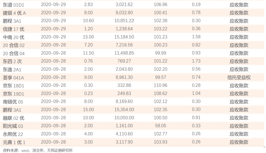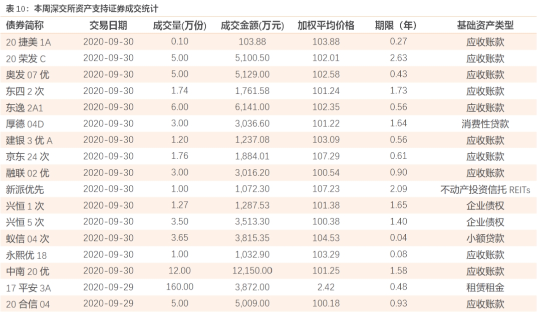 9月28日-30日深交所资产支持证券成交324.83万份,成交金额17.05亿元,基础资产包括企业债权、不动产投资信托REITs、应收账款、小额贷款、信托受益权,消费性贷款、租赁租金。