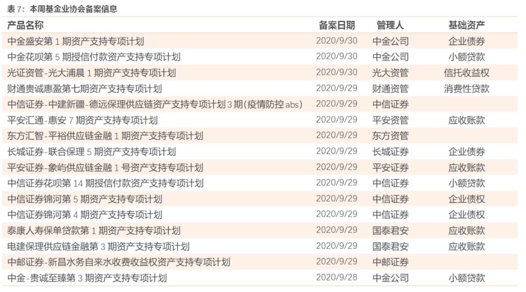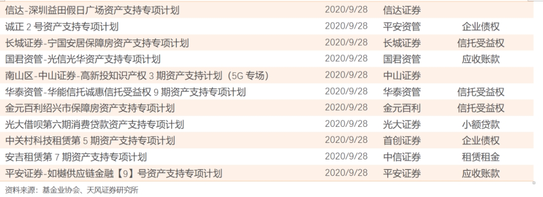9月28日-30日有16期资产支持专项计划在基金业协会备案,本次备案产品中,基础资产包括应收账款、小额贷款、租赁租金、消费性贷款、信托受益权、企业债权。
