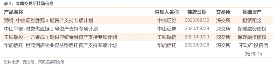 9月28日-30日有4期资产支持专项计划在交易所挂牌,均在深交所挂牌,本次挂牌转让产品中,基础资产为租赁租金、保理融资债权、不动产投资信托REITs。