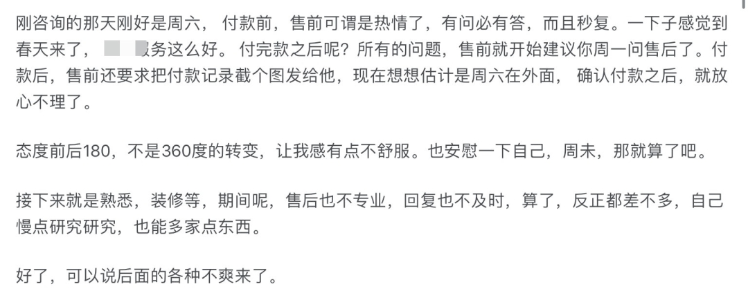 同时,知乎等平台有商家反馈,销售人员卖出工具前后,态度存在天壤之别:在把货物卖出去后,售后爱答不理,回复也不及时。