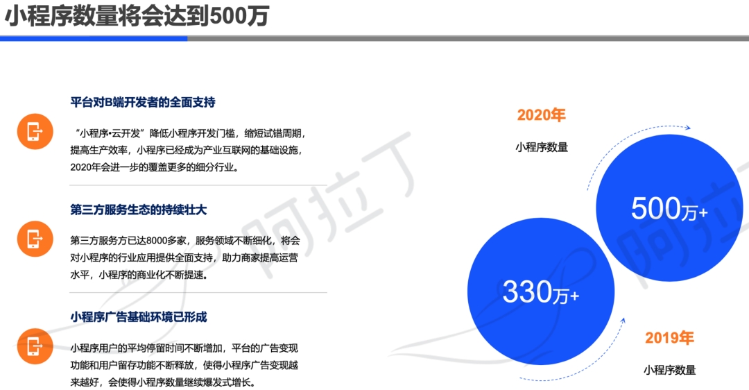 据阿拉丁指数共同发布的《2019年小程序互联网发展白皮书》,截止2019年11月,全网小程序数量超过450万,据预测,2020年小程序数量会达到500万+。与此同时,第三方服务商已达8000多家。