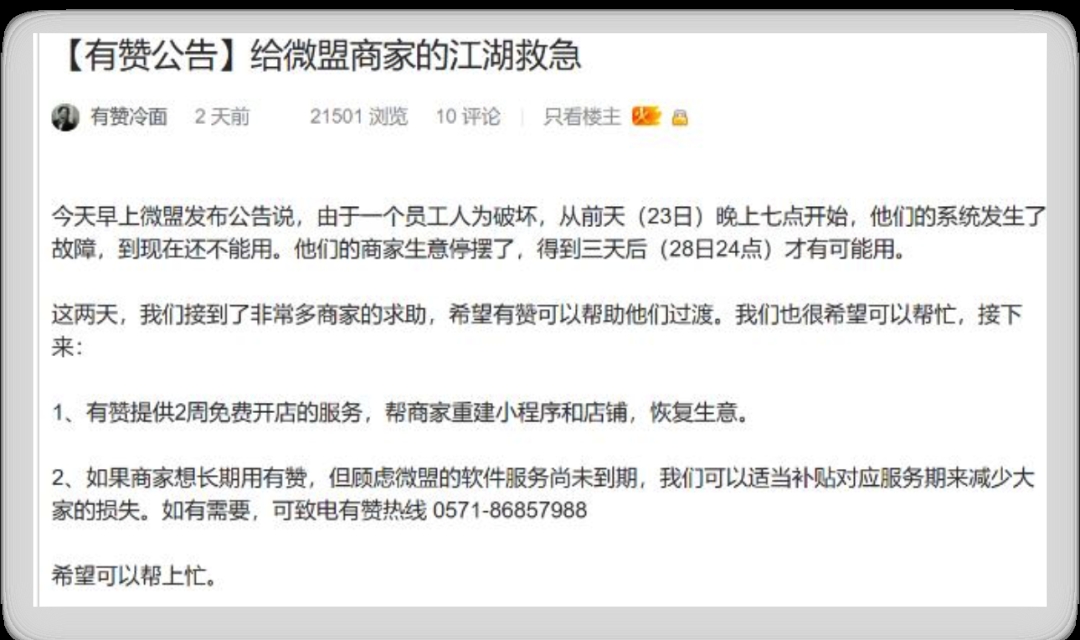 比如去年,微盟程序员删库跑路后,系统出现故障后,有赞创始人白鸦在微信朋友圈表示:“有赞的商家论坛也来了很多微盟的商家咨询有赞可不可以帮他恢复生意,这些都让人挺担忧的。”