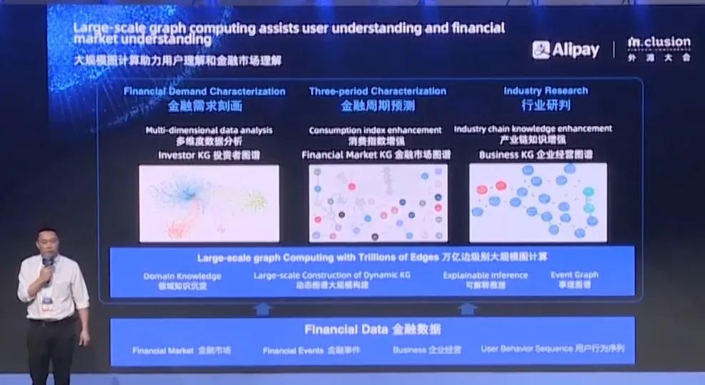 2)大超大规模图学习和计算解决用户关键性属性刻画不完整问题:图计算通过知识推理的方式建立起来人与人之间,投资者与投资者之间的关系,网络知识推理的方式来加厚对客户金融属性的洞察和理解。能端到端地从系统、存储计算算法、以及应用架构进行深度的优化超大规模图学习和计算。