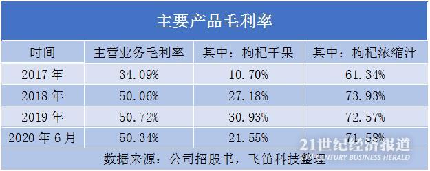 枸杞浓缩汁是公司主要的枸杞汁产品,公司单独披露其毛利率。报告期内,枸杞浓缩汁的毛利率分别为61.34%、73.93%、72.57%和71.58%,公司枸杞浓缩汁的毛利率要远高于枸杞干果的毛利率,是公司毛利的主要贡献来源。