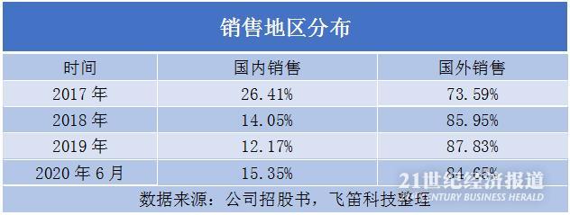 从销售区域来看,公司的营业收入以外销为主,欧洲和美洲是国外销售收入的主要来源。报告期内,公司国内销售占比分别为26.41%、14.05%、12.17%和15.35%,国外销售占比分别为73.59%、85.95%、87.83%和84.65%。