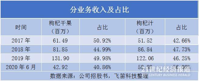 报告期内,枸杞汁销售收入分别为5152万元、8684万元、1.22亿元和5888万元,其中主要是枸杞浓缩汁的收入,占枸杞汁收入的比例超过90%。公司枸杞汁销售收入逐年增长,主要由枸杞浓缩汁的销量增长所带动。收入占比来看,枸杞汁的收入占主营业务的比例呈上升趋势。