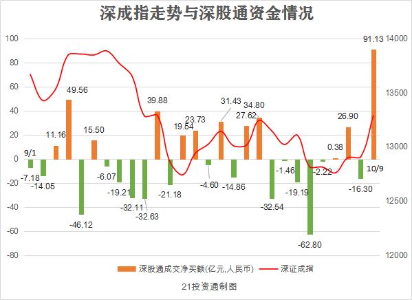 节前北上资金连续8个交易日呈现净卖出,其中9月24日净卖出达到121.68亿元。但节后第一天上午就大幅流入140亿。截止收盘,北向资金全天大幅净买入112.67亿,单日净买入额创7月7日以来新高;其中深股通净买入91.13亿元,创4月14日以来新高。