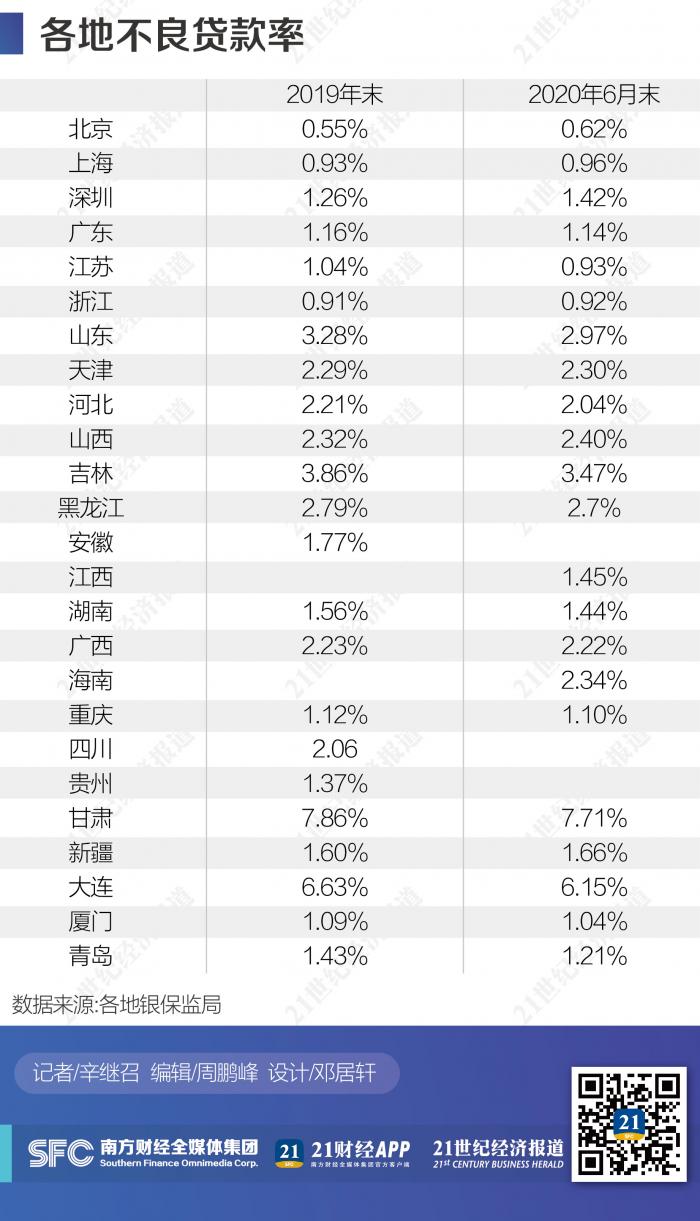 从全国情况看,《21世纪经济报道》记者根据各地银保监和央行数据梳理,截至2020年6月末,北京、上海、江苏、浙江等经济发达地不良贷款率均在1%以下,但深圳不良贷款率有所增加。部分内陆地区不良压力仍然巨大,西北、东北地区部分省份不良贷款率仍高居不下。