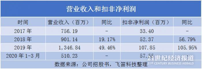 从往年数据看,2017至2019年,公司实现营业收入分别为7.56亿元、9.01亿元和13.47亿元,公司营收增速加快,2019年同比增长49.46%。同期扣非净利润分别为3340万元、5237万元和1.08亿元,2018年和2019年同比增长56.79%和105.95%,净利润的同比大于营收的同比。
