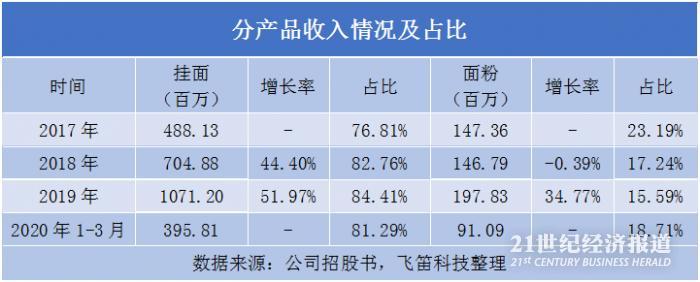公司的挂面产品主要包括原味经典面和上选特色面,报告期内,挂面产品实现收入分别为4.88亿元、7.05亿元、10.71亿元和 3.96亿元,同比增速加快,占比分别为 76.81%、82.76%、84.41%和 81.29%,呈波动上升趋势,2020 年 一季度略有降低,主要因为疫情期间,消费者增加面粉储备消费。
