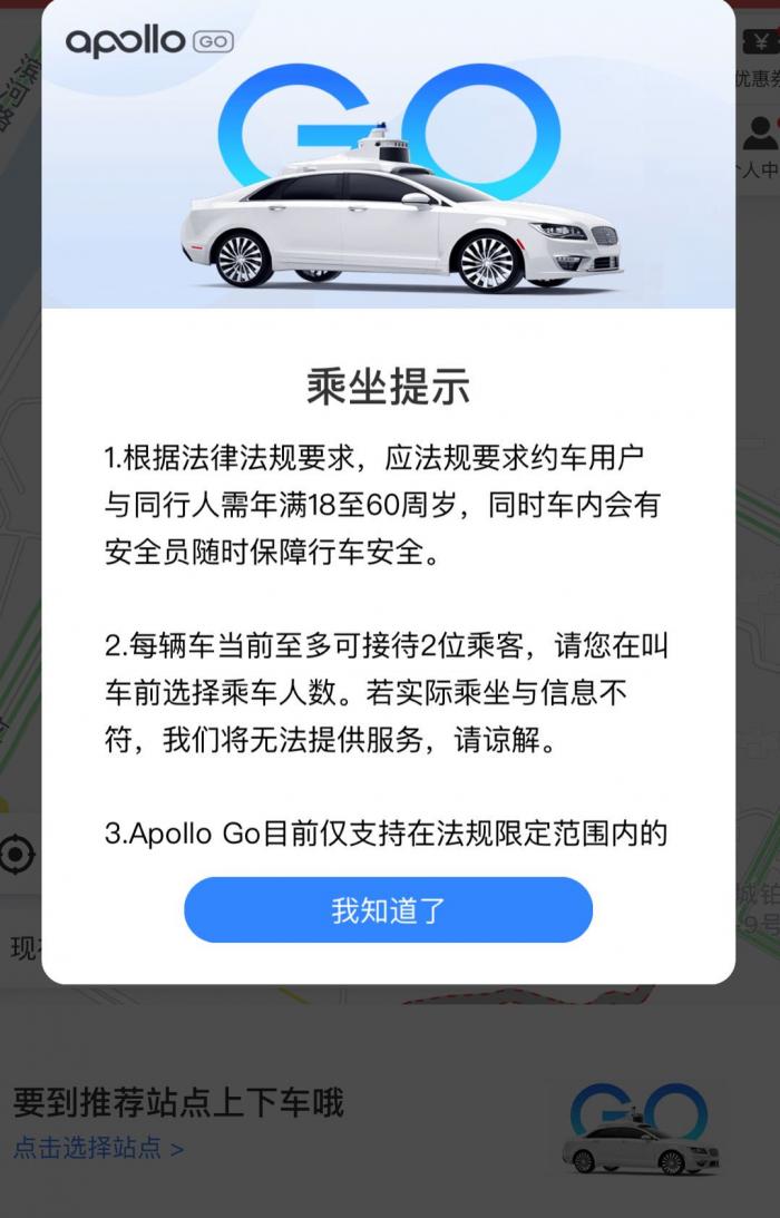 此外,由于市民体验自动驾驶出租车时,上下车均需要在指定的数十个站点乘车,在百度推出的独立APP Apollo GO上,不仅能够为市民智能推荐附近上车点,还能显示市民到推荐起点的导航路线,引导市民更快到达乘车点。