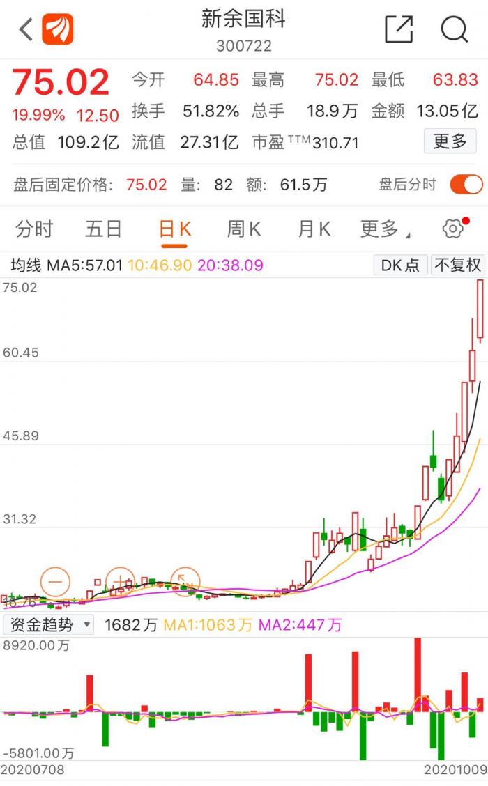 新余国科在10月9日上涨19.99%,报收75.02元/股,该股自9月25日至今,5个交易日内股价已经实现翻倍,累计上涨幅度达到108.27%。