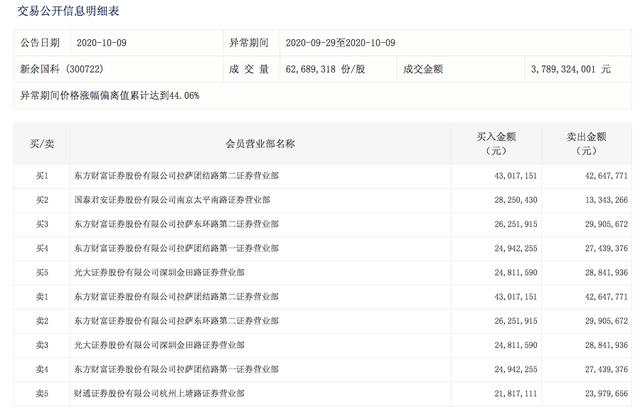 根据深交所龙虎榜,9月29日-10月9日,新余国科涨幅偏离值累计达到44.06%,成交金额达到37.89亿元。其中,东方财富拉萨团结路第二营业部买入4301.72万元,卖出4264.78万元,东方财富拉萨东环路第二营业部买入2625.2万元,卖出2990.57万元。