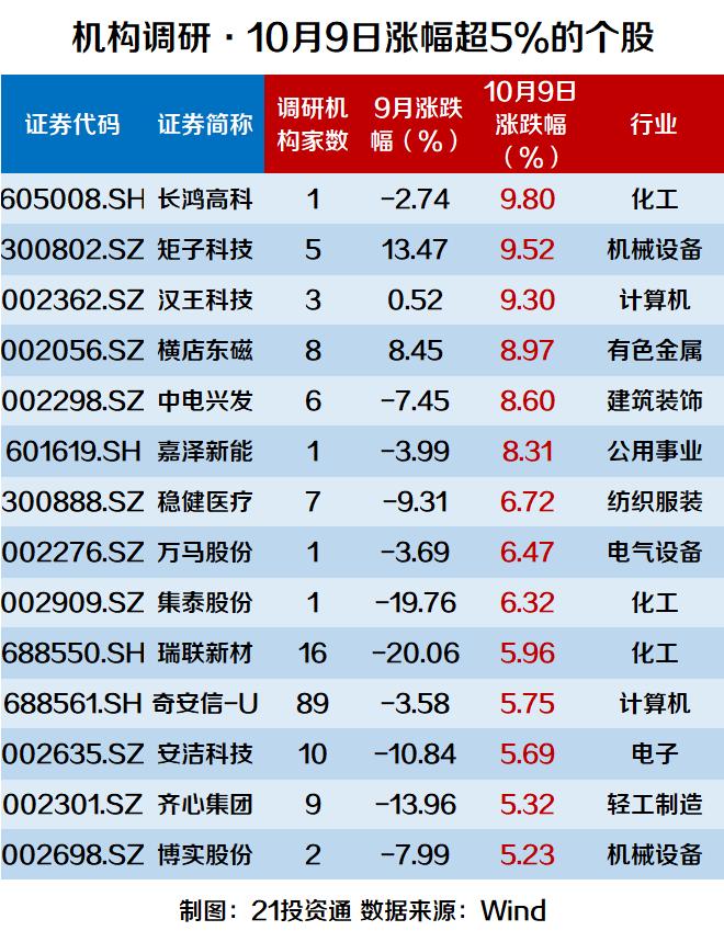数据显示,这45家公司9月平均涨幅为-4.6%,12家公司9月股价总体上涨,33家股价下跌。10月9日当天,仅牧原股份(002714.SZ)一股下跌,其余44股均收涨,其中14股日涨幅超过5%,3股涨超9%——长鸿高科(605008.SH)、矩子科技(300802.SZ)、汉王科技(002362.SZ)。