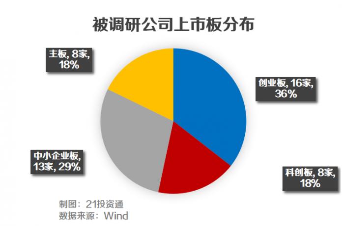统计显示,被机构调研的这45家公司中,属于中小板的有13家,属于创业板的有17家,另外主板、科创板均有8家;中小创占比65%。