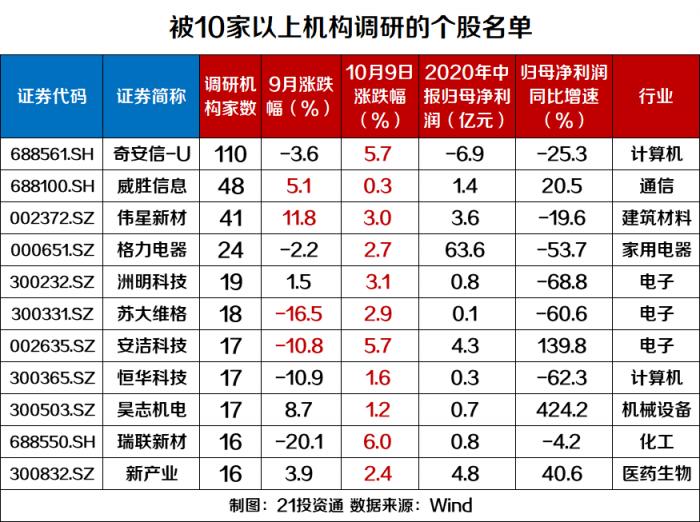 具体到上市公司,奇安信-U(688561.SH)最受欢迎,接待了110家机构!此外,威胜信息(688100.SH)接待了48家机构、伟星新材(002372.SZ)接待了41家机构。