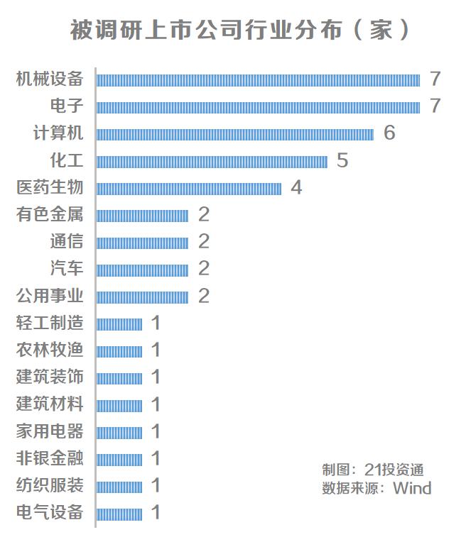 从行业来看,这45家公司涉及17个申万行业,其中机械设备、电子行业最受机构青睐,均有7家公司被调研。