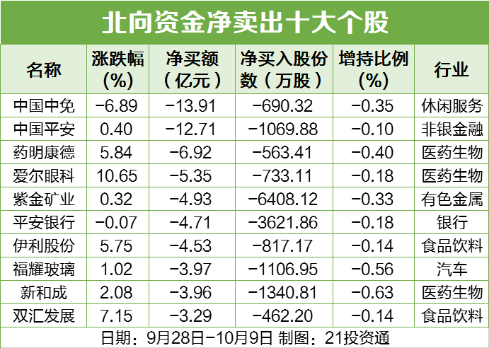 而此前一周被净买入5.81亿元的免税龙头中国中免(601888.SH)在过去4个交易日被净卖出13.91亿元,居减持榜首位。