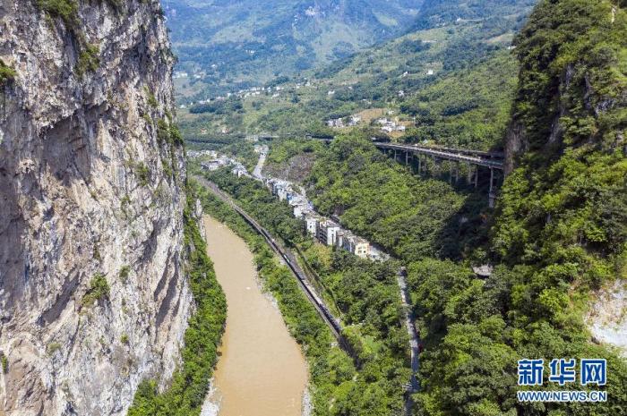 在云南省昭通市盐津县豆沙关,五尺道、关河水道、内昆铁路、G247公路及G85渝昆高速5条不同时期的交通线路以几乎并行的姿态呈现眼前(8月10日摄,无人机照片)。