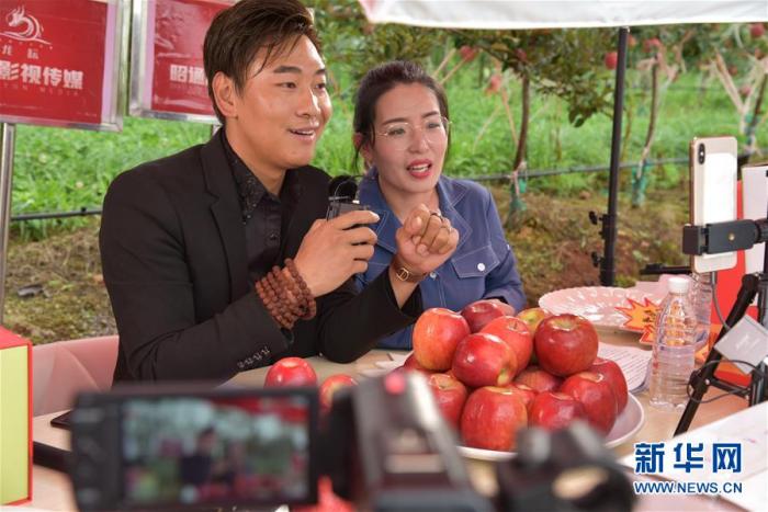 工作人员在云南昭通苹果种植基地通过网络直播售卖苹果(8月18日摄)。新华社记者林碧锋摄