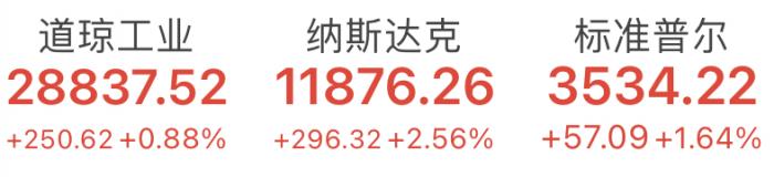美国东部时间10月12日,投资者预计财报季企业表现将好于预期,三大股指集体上涨,其中纳指创9月9日以来最大日涨幅。截至收盘,道琼斯工业平均指数涨0.88%,报28837.52点;纳斯达克综合指数涨2.56%,报11876.26点;标普500指数涨1.64%,报3534.22点。