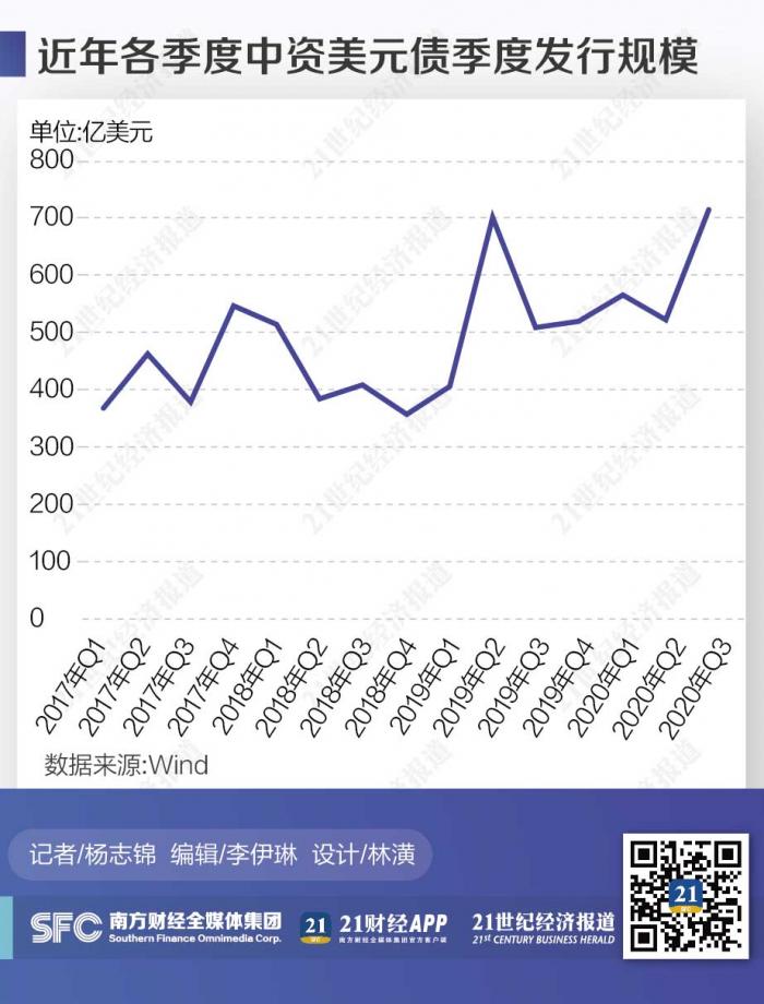21世纪经济报道记者根据Wind统计发现,今年三季度中资美元债发行规模为715.75亿美元,环比大增36%,创出历史新高。在此之前,中资美元债发行规模季度峰值为2019年二季度,当季发行规模为702.25亿美元。