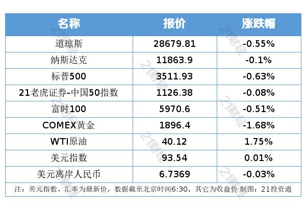 4、美股集体收跌,道指跌逾150点终结连续四日上涨走势。截至收盘,道指跌0.55%,报28679.81点;纳指跌0.10%,报11863.90点;标普500指数跌0.63%,报3511.93点。21老虎证券-中国50指数跌0.08%,报1126.38点。