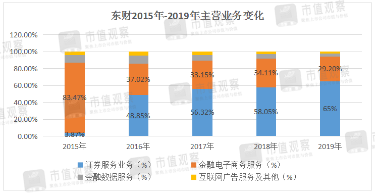从目前的营收结构看,东财的券商属性也毋庸置疑,2015年-2019年,东财的证券服务业务收入占比从微不足道的3.87%升至65%,2020年上半年这一数据是55.9%。