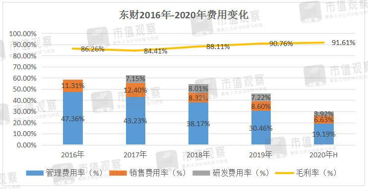 数据显示2016年-2020年上半年,东财的毛利率从86%逐渐攀升至近92%的水平,且期间的费用率(管理费用+销售费用+研发费用)占比不断下降,从58.7%下降至29.7%,四年半间费用率整体下降了近30个百分点。毫无疑问,下降的费用率空间变相成为其净利率提升的空间。