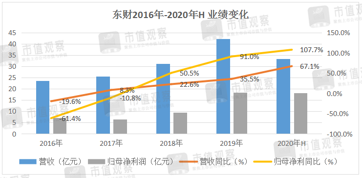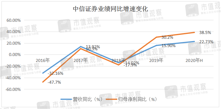 不过就业绩的同比增长看,传统券商的增长并不逊色,拿中信证券为例。数据显示,2016年-2020年H1期间,中信证券营收、归母净利也在稳步攀升,2020年上半年,中信证券营收增速22.7%,相当于东财同期的34%,归母净利增速达到38%,相当于东财同期的36%。
