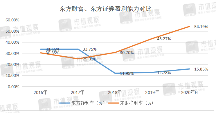 市值观察筛选了与东财净利润体量大致相似的东方证券(600958)作为比较对象,2020年上半年,东财归母净利润18.09亿元,东方证券归母净利润15.26亿元,创造相似的净利润两者所对应的营收是:东方证券需要96.25亿元,东财仅为33.38亿元,几乎为后者的1/3。