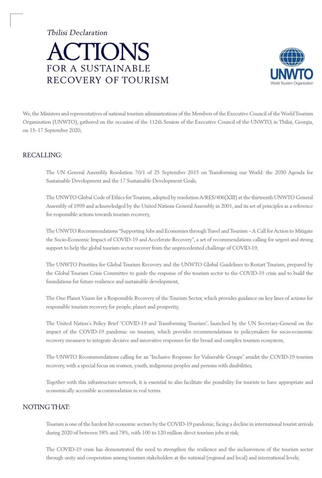 今年9月,于格鲁吉亚第比利斯举行的第112届世界旅游组织执行委员会会议上,来自24个国家的170名代表通过旅行行业的可持续发展宣言《第比利斯宣言》,承诺确保国际旅行重新变得安全。