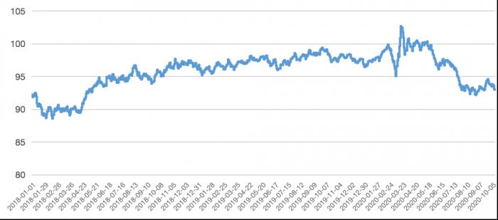 图2:2018年1月-2020年10月美元指数走势变化情况