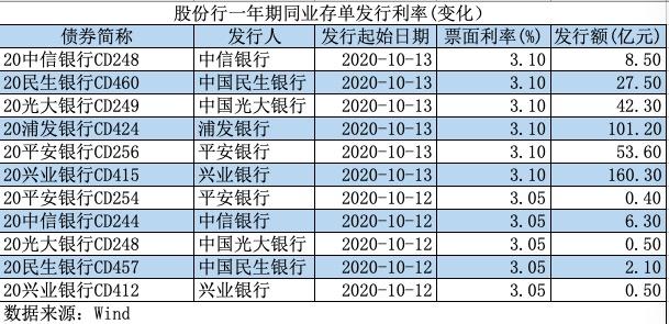 10月13日,民生银行、浦发银行、光大银行等股份行一年期同业存单发行利率均为3.1%,相比上日上行5BP,创去年12月以来的新高。