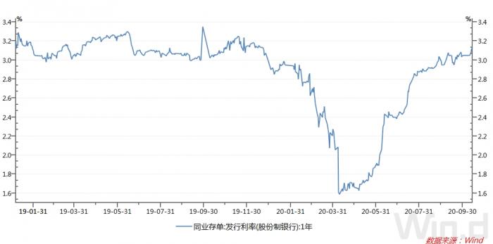 以股份行一年期同业存单加权平均发行利率为例,今年2月疫情爆发之后,受益于货币政策宽松力度加大,同业存单利率大幅下行,创下历史新低,且在4-5月维持极低水平(1.7%左右),之后随着货币政策边际收紧,6-8月同业存单利率逐渐回升,恢复至疫情前的水平。9月后继续上行,超过了年初的水平。