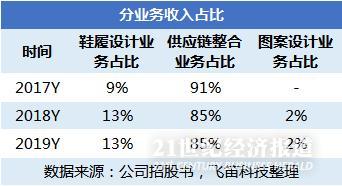 中胤时尚的业务主要分为两大块,分别为设计业务和供应链整合业务,设计业务又分为鞋履设计业务和图案设计业务。2017年至2019年,这两大业务占公司营业收入的比重约15%和85%。