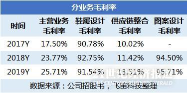 2017年至2019年,公司主营业务毛利率分别为17.5%、23.77%和25.71%,毛利率为上升趋势,主要受核心业务鞋履设计的带动。