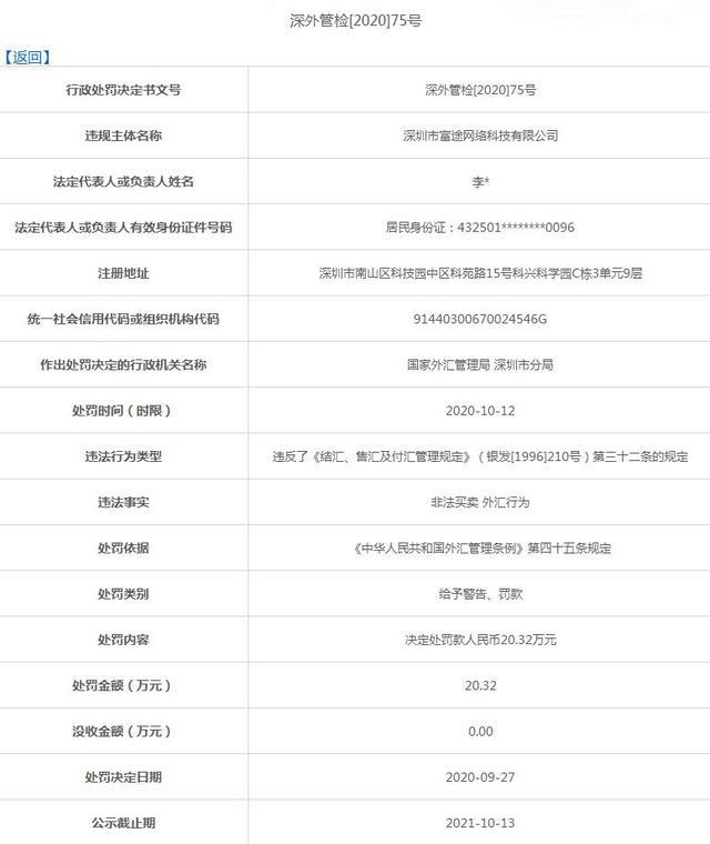 深外管检[2020]75号罚单显示,因非法买卖外汇行为,违反了《结汇、售汇及付汇管理规定》(银发[1996]210号)第三十二条的规定,处罚决定日期2020年9月27日,国家外汇管理局深圳市分局对其处罚20.32万元,并对其给予警告。公示截止期2021年10月13日。