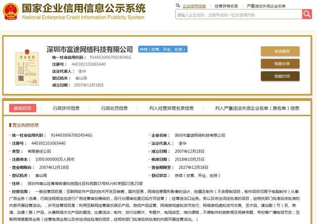 国家企业信息公示系统显示,深圳市富途网络科技有限公司成立于2007年12月18日,注册资本1000万元,法定代表人为李华。经营范围包括互联网软件产品的技术开发及销售,国内贸易,网络创意图形影像的设计、拍摄及制作(不含限制项目,制作项目仅限于电脑制作)从事广告业务(法律、行政法规规定应进行广告经营审批等级的,另行办理审批登记后方可经营);经营进出口业务等。