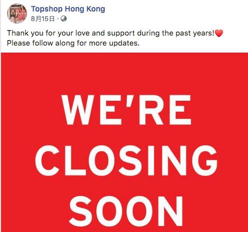 美国服装品牌GAP宣布在香港关闭5家分店,英国快时尚品牌Topshop于8月中宣布,旗下位于中环的两层旗舰店将于10月租约到期后关闭,该品牌在分店关闭后只会维持网店业务。Topshop在2012年曾以月租300万港元承租中环皇后大道中铺位开设旗舰店;2014年则分别在金钟、铜锣湾开设分店。