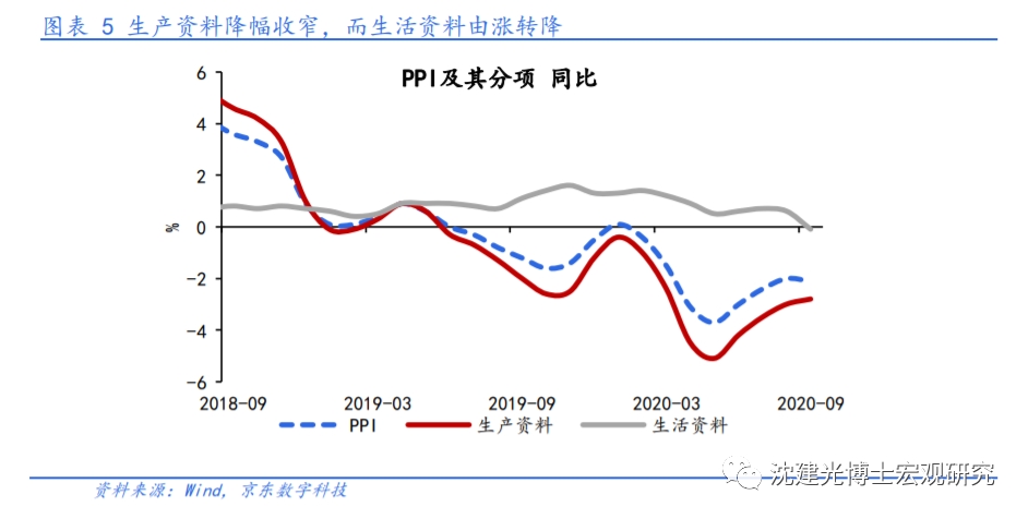 PPI跌幅略有扩大,回升趋势受阻。9月PPI环比0.1%、同比跌幅扩大至2.1%。其中,生产资料同比降幅收窄至2.8%,而生活资料由涨转降,下降0.1%。分行业看,油气开采、石油煤炭加工、有色采选和加工、黑色采选和加工等行业环比均有回落,符合9月PMI出厂价格指数和工业品价格小幅回调的表现。