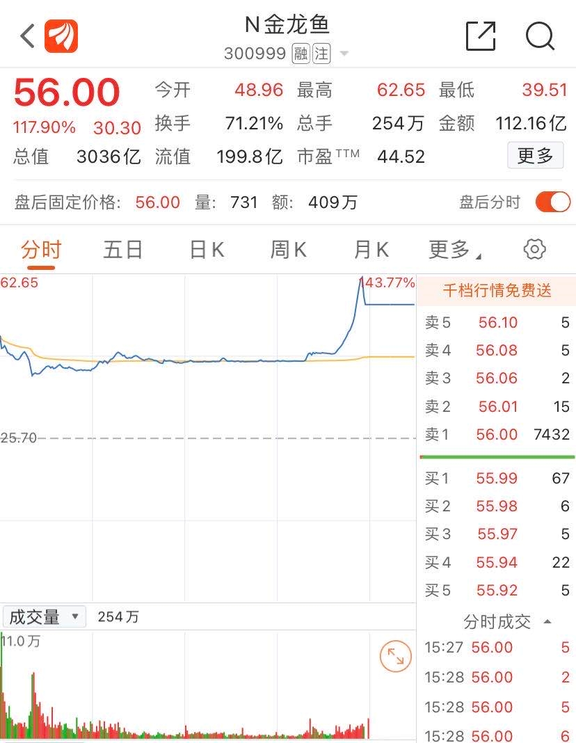 “那么大的盘子肯定涨不动,我开盘就卖了”股民小李向老金说到,的确,金龙鱼上市交易后几乎在41-43左右的价位横了一整天,股民们也卖了一整天,不过,临近收盘,金龙鱼股价出现异动,股价近乎直线拉起,盘中最高上涨142.1%,达62.2元,截止收盘上涨117.9%,报收56元,成交112亿元,换手率71.21%。