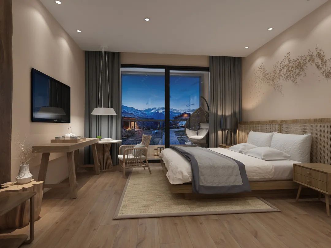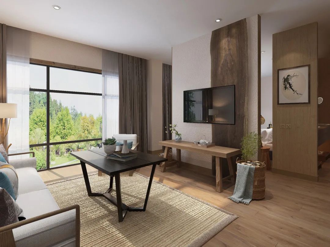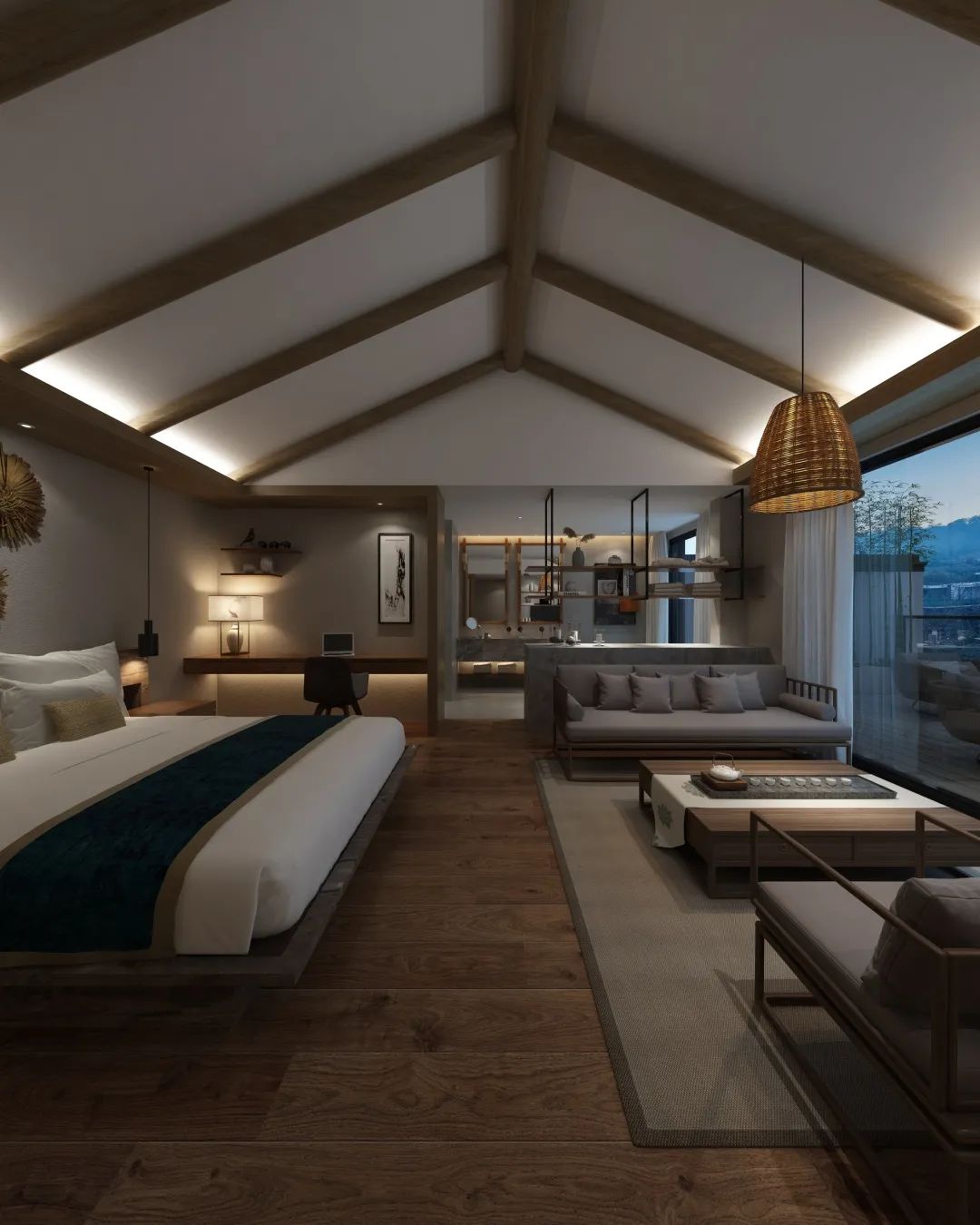 如果说建筑外部让你感觉置身一片绿洲,那房间内部的设计就让你有了下江南的实感。一切设计均从传统江南之景中汲取灵感,采用原木和竹元素搭配浅色布艺装饰,山野意趣中不乏舒适质感。
