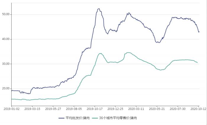 从农业农村部、国家发改委监测数据来看,虽然9月猪肉价格相对而言仍处于高位,但回调态势明显。像农业农村部监测的平均猪肉批发价,9月初在48元/公斤,9月底则回调到45元/公斤。国家发改委监测的36个城市猪肉平均零售价,从9月初的31.65元/斤,降至9月底的30.74元/斤。