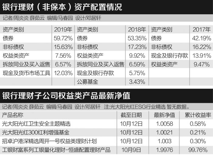 目前银行理财子公司只发行了5款权益类产品。但大多数理财子公司发行的固收类和混合类产品中都配置了权益类资产,配置比例通常在20%或30%以内,不过也有部分混合类产品的上限高达70%。