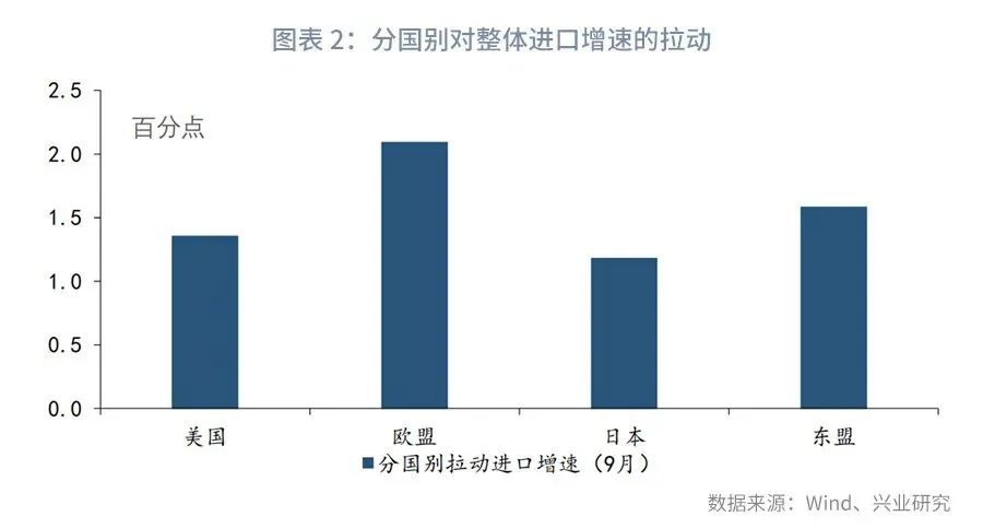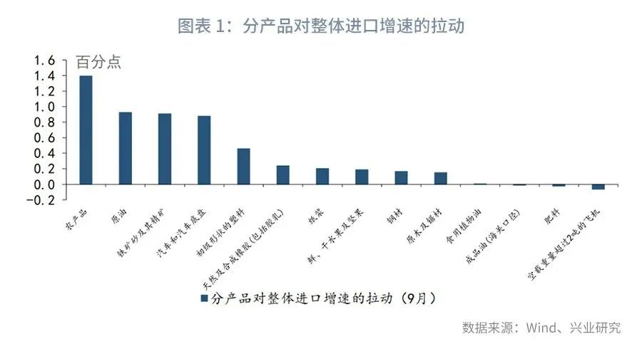 无论是从进口产品还是从进口来源地看,本次进口增长 “全面开花”:分产品看,从已公布的数据看,除飞机、肥料、成品油、食用植物油等少量产品外,其他主要进口产品如农产品、原油、铁矿砂及其精矿等进口增速均回升,分别拉动整体进口增速回升0.9至1.4个百分点,参见图表1;分国别看,9月我国自主要贸易伙伴进口增速较前月回升幅度均在10个百分点以上,其中自美国进口增速回升22.9个百分点,拉动整体进口增速回升1.4个百分点,自欧盟进口增速回升15.7个百分点,进而拉动整体进口增速回升2.1个百分点,参见图表2。