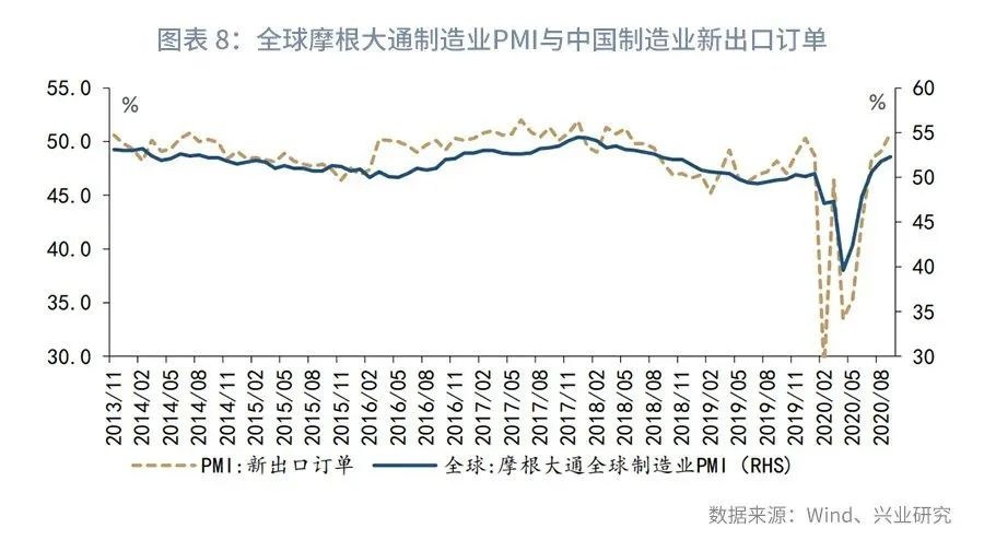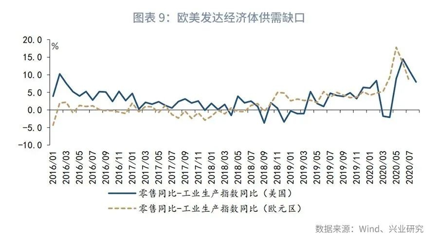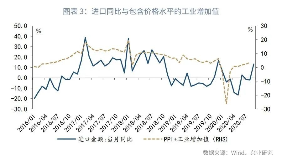 第一,国内经济复苏领先进口复苏。2020年3月以来,我国经济进入强劲复苏通道,经济增速由第一季度的-6.8%回升至第二季度的3.2%,目前市场预计第三季度经济增速有望回到5%以上的水平。国内经济强劲复苏具有显著的正向外溢效应,我们以工业增加值与PPI之和代理名义经济增速,数据显示名义经济增速与进口走势基本一致,2020年我国名义经济增速自2月以来持续修复,大致领先进口增速拐点1个季度,参见图表3。