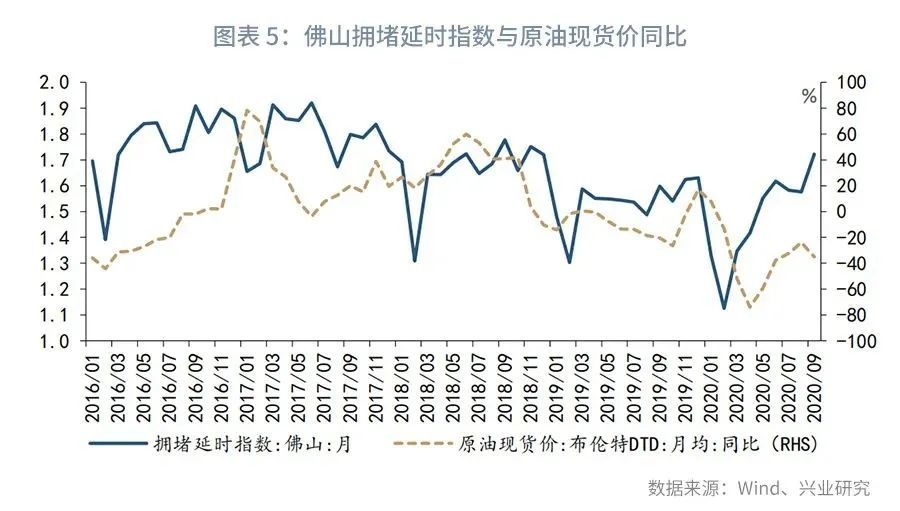 第三,我国经济复苏带动大宗商品价格回暖。我国作为主要原油消费及进口国,其需求回暖对原油价格具有显著正向促进效应。具体本文以珠三角制造业城市佛山的拥堵延时指数代理经济活跃度,数据显示,2020年我国经济活跃度回升拐点领先于原油价格,参见图表5。